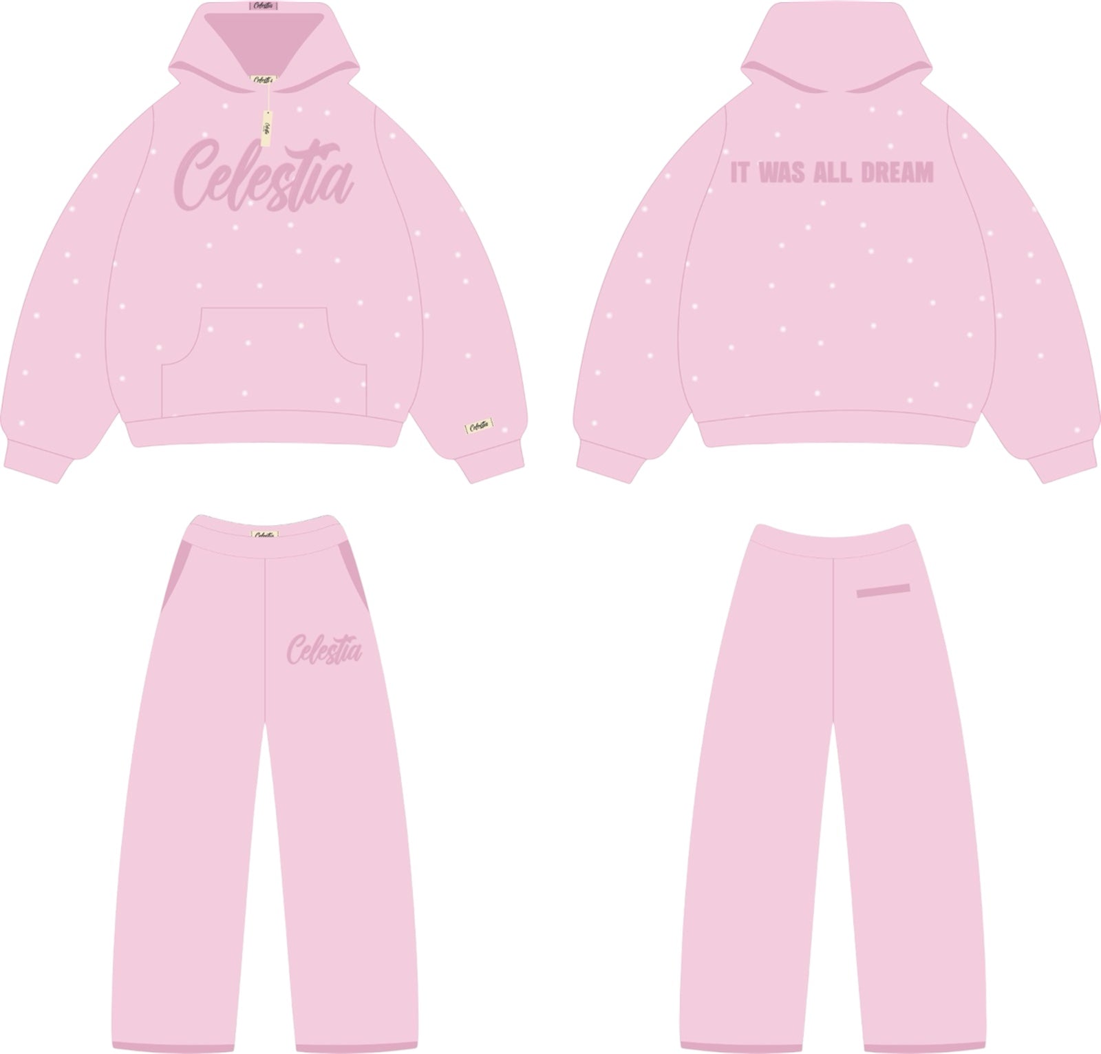 This baby pink oversized sweatsuit blends soft femininity with bold puff prints and delicate rhinestone accents. Cozy yet eye-catching, it's made for those who dream in color and move through the world with effortless confidence.