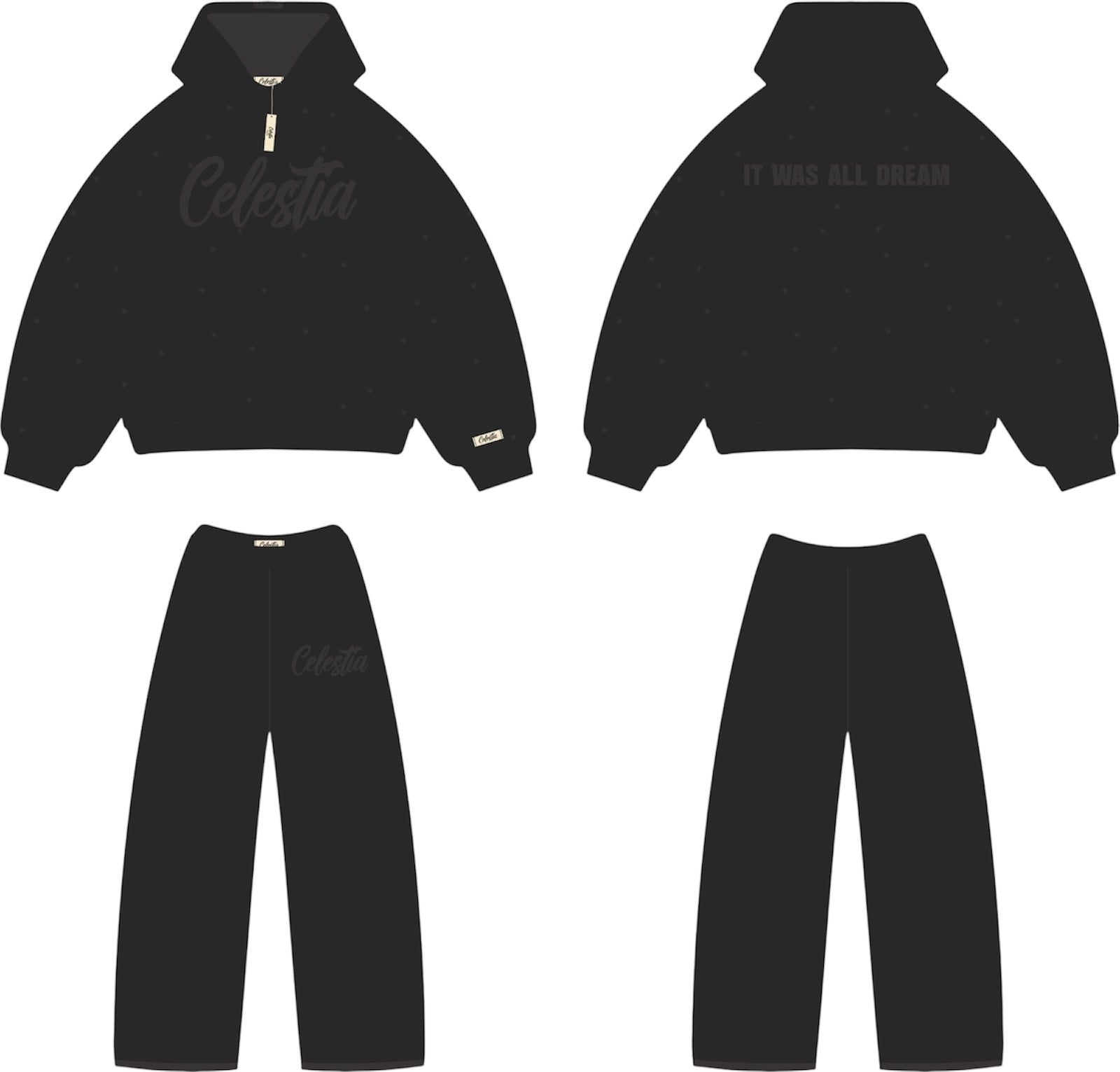 This vintage black oversized sweatsuit exudes understated luxury with tonal black suede prints and subtle rhinestone accents. Effortlessly blending comfort and street sophistication, it’s made for those who turn quiet strength into bold statements.